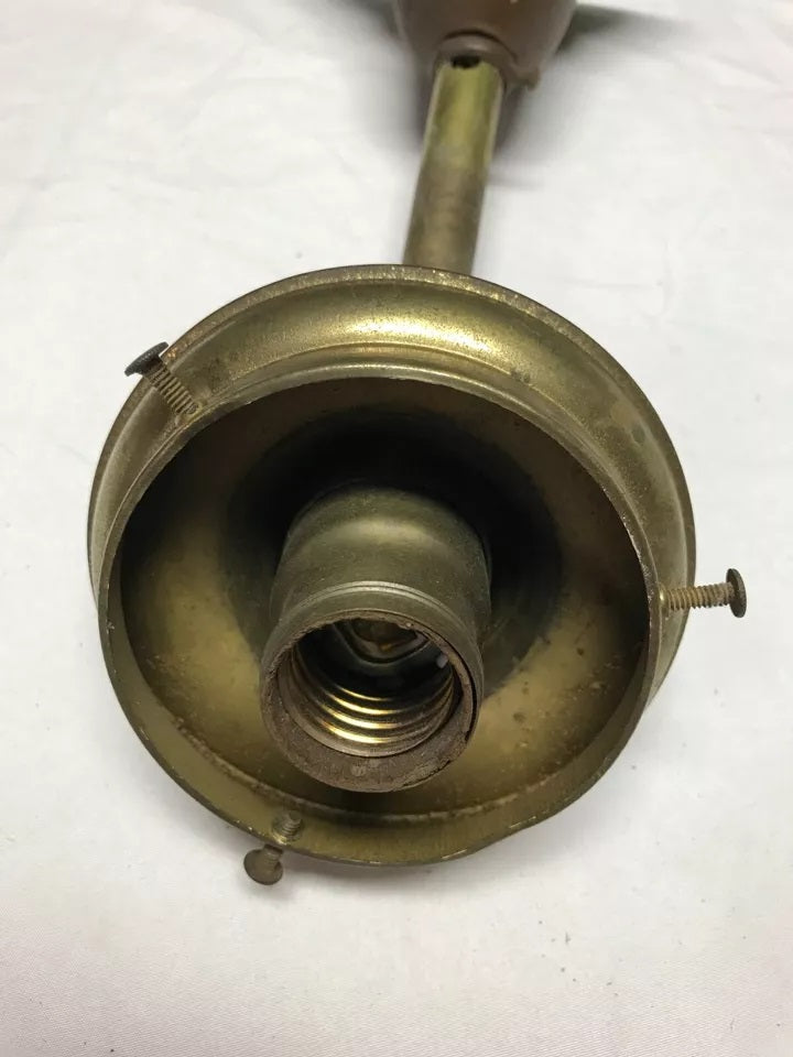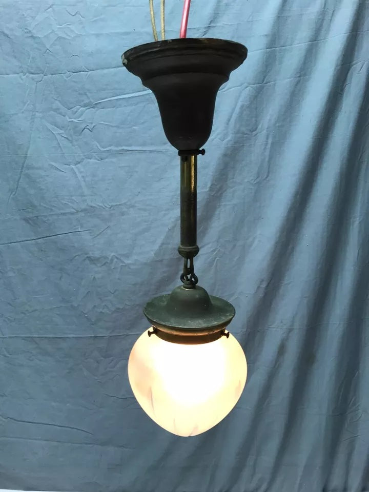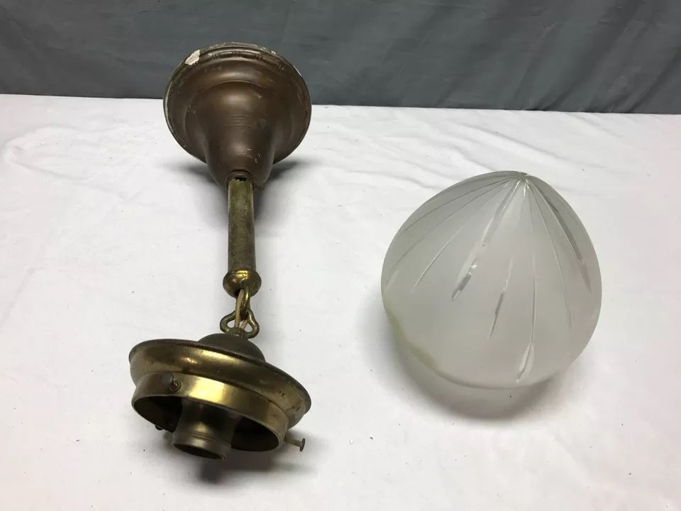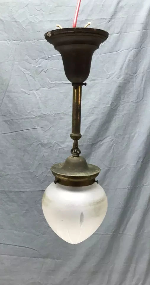 Great antique brass ceiling mount light fixture, with a nice frosted textured onion globe.  The globe is complete without any chips or cracks.  The light and canopy are made of brass. The brass finish is tarnished and scuffed. The socket looks original, the wire is new. The light does work as tested.  Overall, this light is in good condition. There is no ceiling mount hardware included. Please look over the pictures carefully and ask any questions if needed. Thanks for looking!
