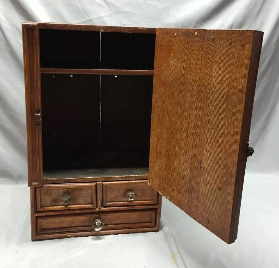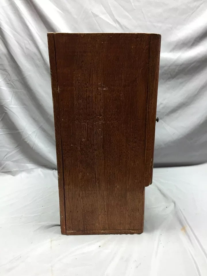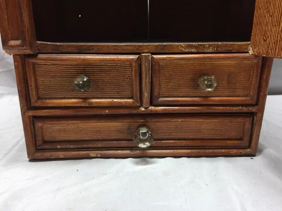 Antique Oak hardwood medicine cabinet with a nice beveled oval mirror with a three drawer bottom. This cabinet is in a wood grain painted finish. The door has a metal latch, and the drawers have nice glass pulls. The drawers function as they should. The mirror has some scratches, streaks, and some ghosting but is in good usable condition. This cabinet is well built and weighs 30 pounds. This cabinet has a nice Folk art look to it. This great old country cabinet would look great in a lodge or cabin or a country home. Overall good condition. Please look over the pictures below and ask questions when needed. Thanks for looking