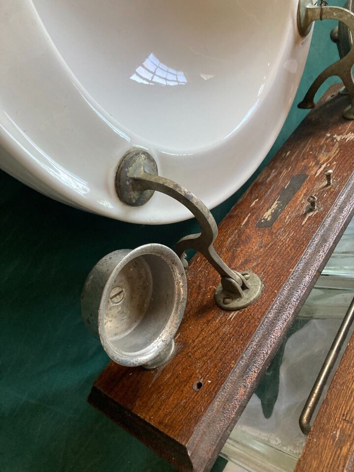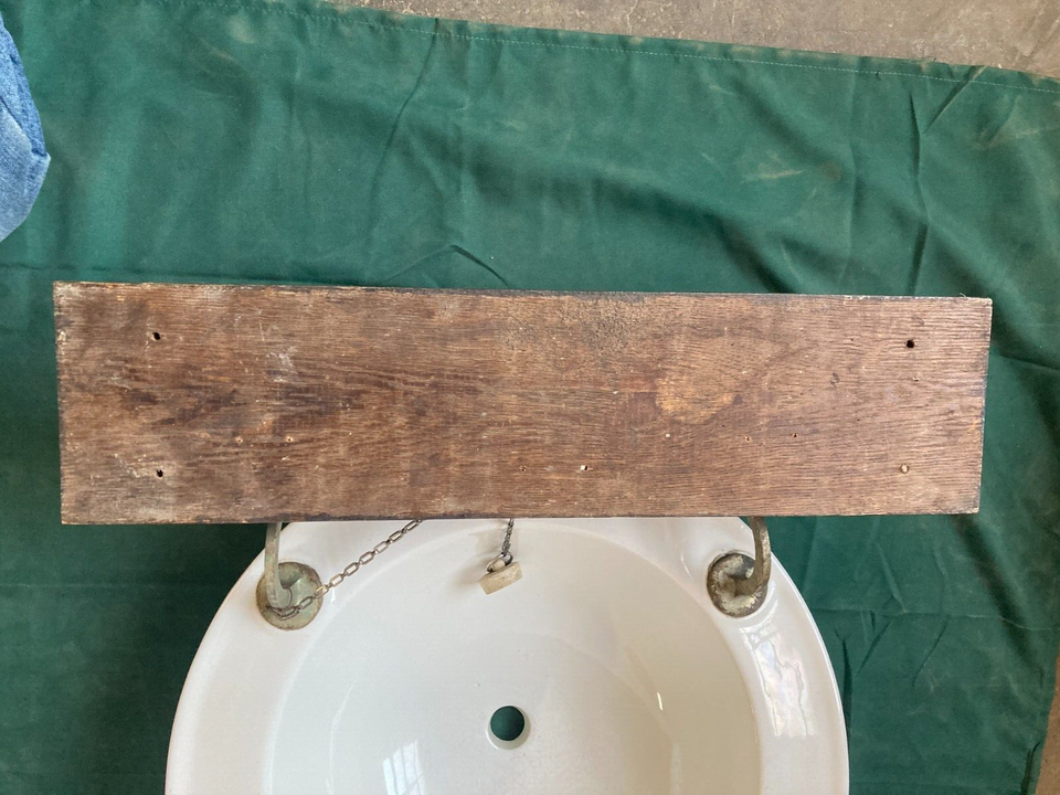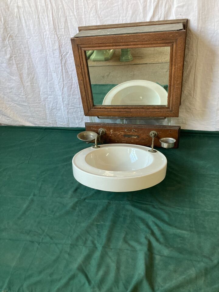 Very cool rare folding sink from an old railroad passenger car with its original galvanized lined oak water tank and mirror. It is marked Rowe Sanitary Lavatory Co c.1890s. The original drain and the fill valve are missing from this otherwise complete set. The original soap dish and cup holder are also still attached. The sink shows normal light wear, minor scratches & scuffs, and some crazing in the bottom of the basin. The finish on the oak cabinet and plaque also shows wear, but it only adds to its charm. The mirror has only light scratches and a small amount of distress in the corners, may not be original, we can't tell for sure. The nickel plating on the soap dish, cup holder, and hinges is worn as shown in the pics. This is a pretty awesome piece of RR history. Overall good, salvaged condition. Please be sure to look over all of the pictures as they are the best description. Feel free to ask questions when needed. Thanks for looking!