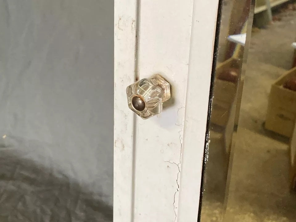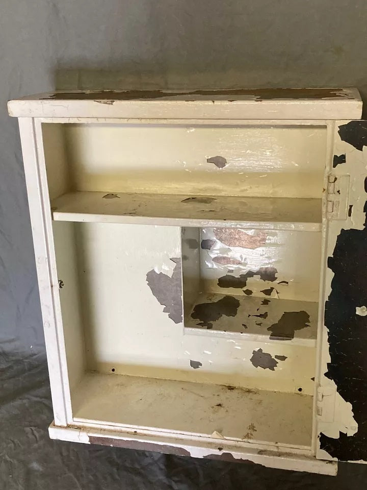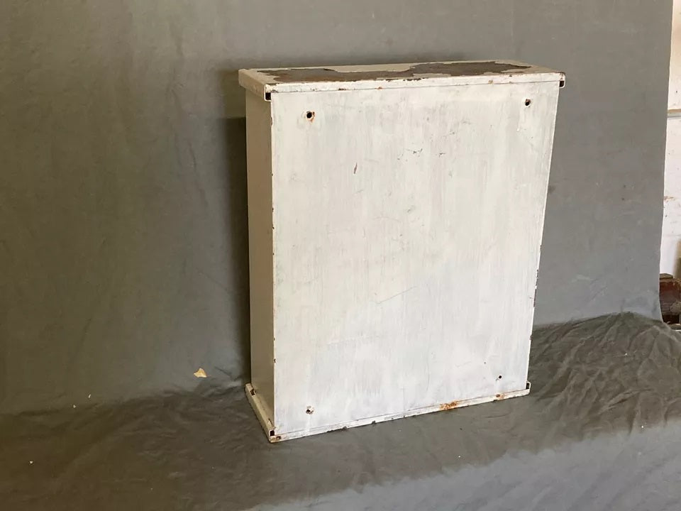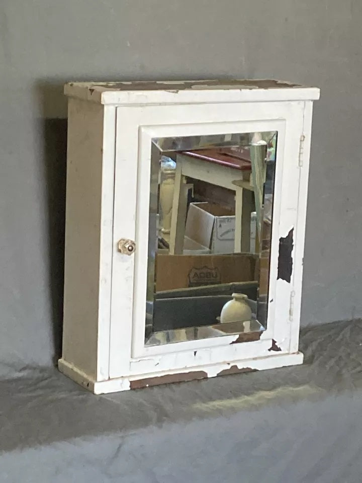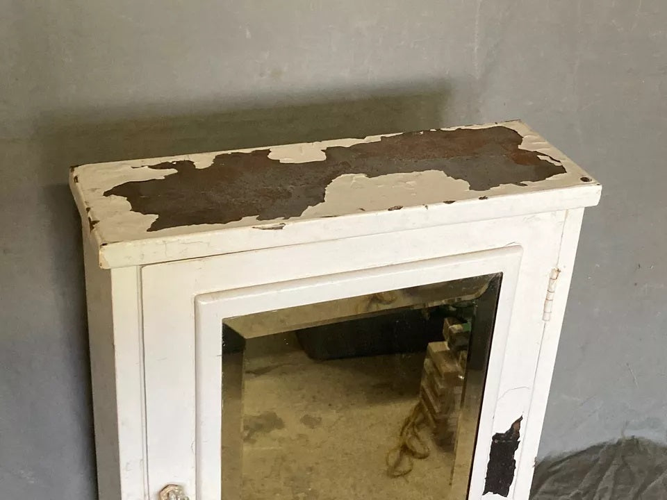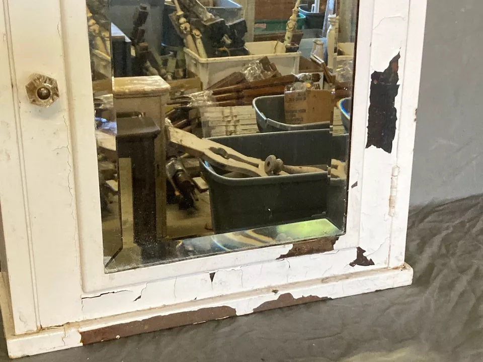 Nice antique surface mount metal medicine cabinet with a beveled mirror. Has 1 1/2 built in shelves. The door operates as it should. Has old chipped worn and flaking white paint with some light surface rust. Has a decorative glass knob. Beveled mirror has some light scratches but still good and usable. Shows wear consistent with its age and use. Overall good, salvaged condition. Please be sure to look over all of the pictures as they are the best description. Feel free to ask questions when needed. Thanks for looking!