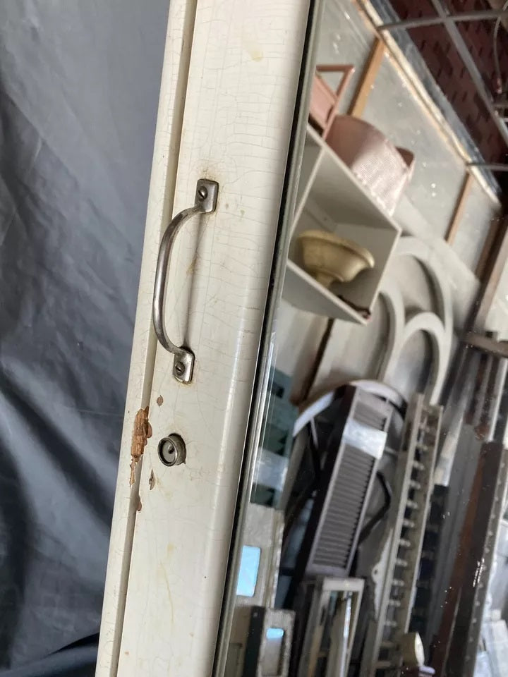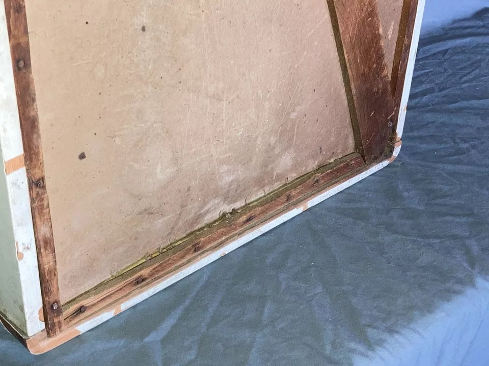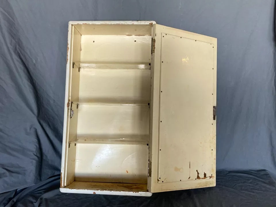 Nice vintage wooden surface mount medicine cabinet. The mirror is new and in very good condition. The cabinet has chrome plated ball finials and door pull. There is old chipped and crackled creamy white paint. The door opens and closes as it should. There are 3 removable plexiglass shelves inside. The cabinet backing is slightly buckled and a little pushed in at the bottom. Overall good, salvaged condition. Please be sure to look over all of the pictures as they are the best description. Feel free to ask questions when needed. Thanks for looking!