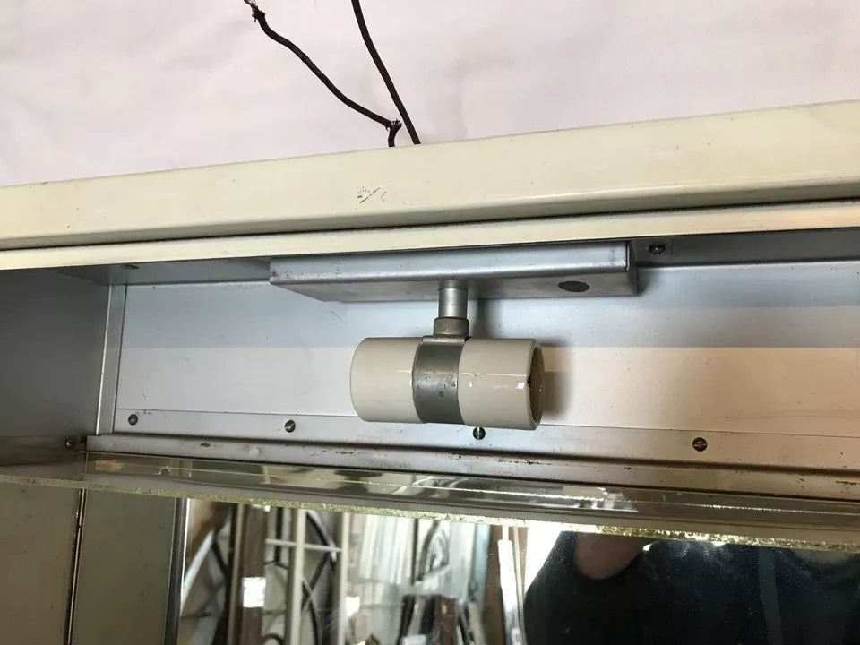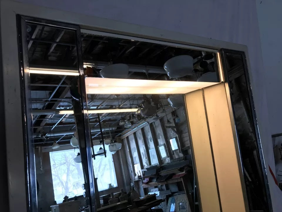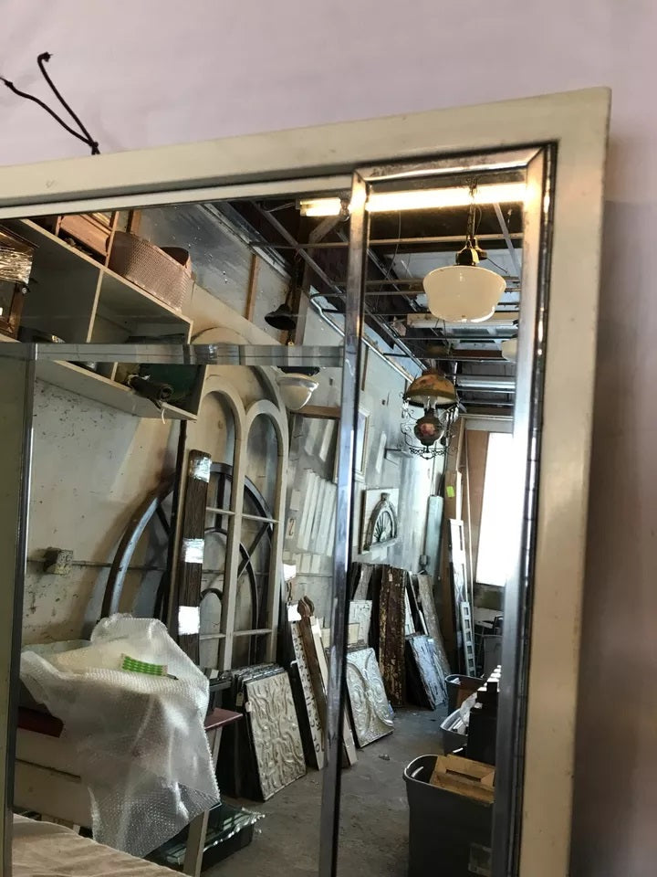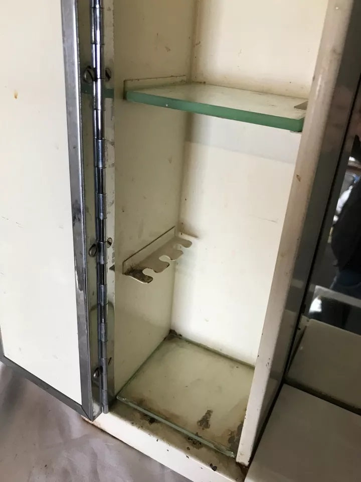Vintage midcentury metal recessed medicine cabinet with double doors with shadow box center. It has old worn creamy tan painted finish with chrome framed doors. The mirror has some light scratches. Otherwise, the mirrors are in usable condition. Both the doors open and close easily. The porcelain double socket is original, and the wires were replaced for testing. The light does work as tested. The top originally had 2 peace thin white glass for shade covers. The bottom is complete, and the face shade was missing. We did replace the missing shade with a mirror and matches and looks great. The light still shines down into the center shadow box. The shadow box has a milk glass shelf bottom. The milk glass is in good condition with a small chip as shown. Each side has 3 stationary bracket removable glass shelfs with a 3-slot toothbrush holder. The glass shelfs are complete but will need a detailed cleaning. The cabinet is unmarked the manufacturer is unknown. Overall good, salvaged condition. Please look over the pictures and ask questions when needed. Thanks for looking!