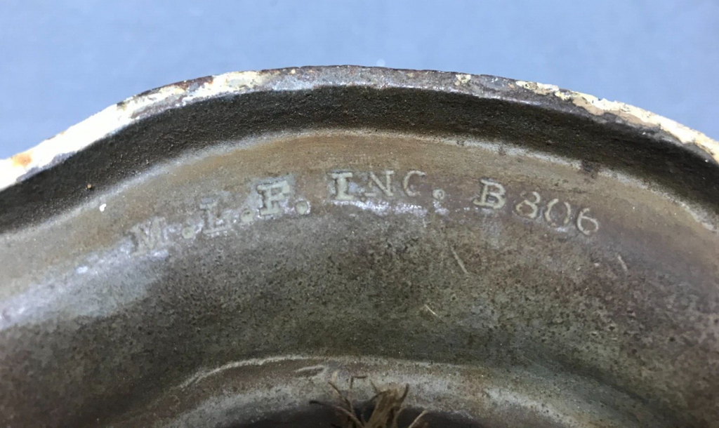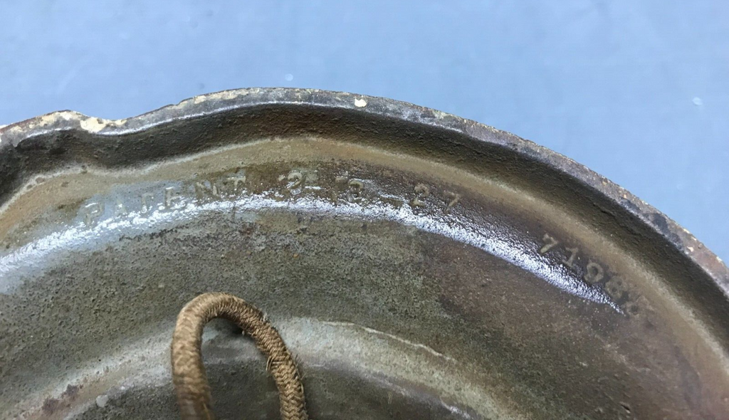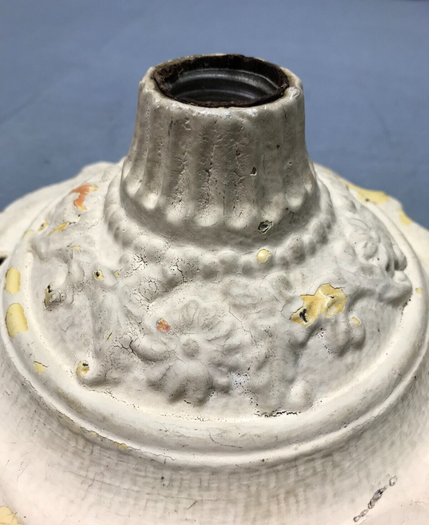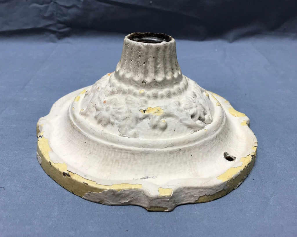 Nice vintage decorative flush mount single bulb ceiling light. It's made of cast iron. Has a nice embossed floral pattern around the neck. The fixture is complete without any breaks or cracks, but overall condition is unknown until the paint is removed. The wire and socket are original and are untested. It is marked B306 Patented 2-3-27 and the manufacturer is MLR Inc. The fixture is in a chipped creamy tan over a butterscotch yellow. There is no ceiling mount hardware included. Overall, in good condition. Please look over photos and ask any questions needed thanks.