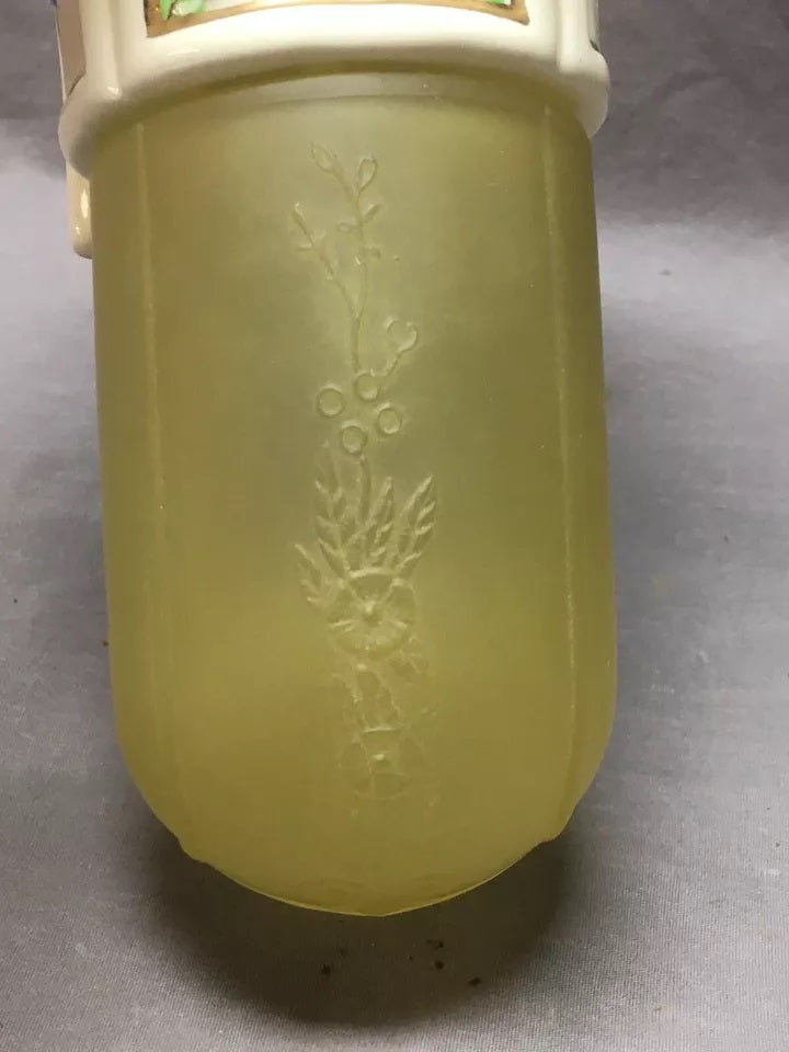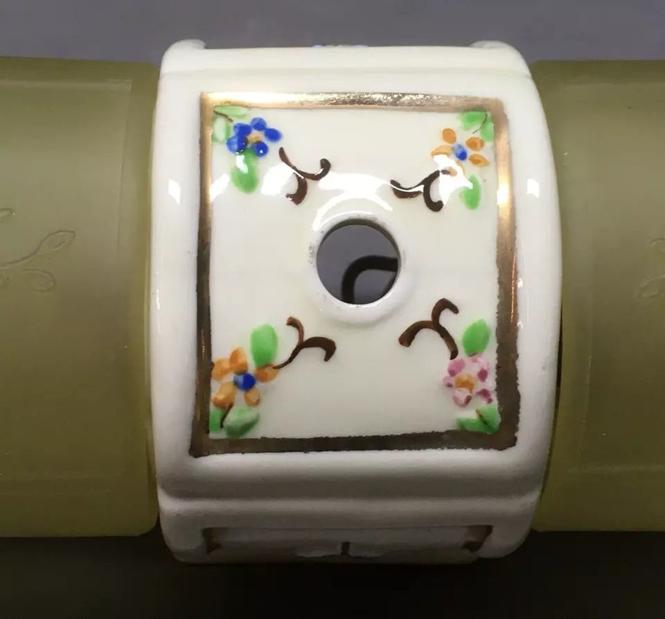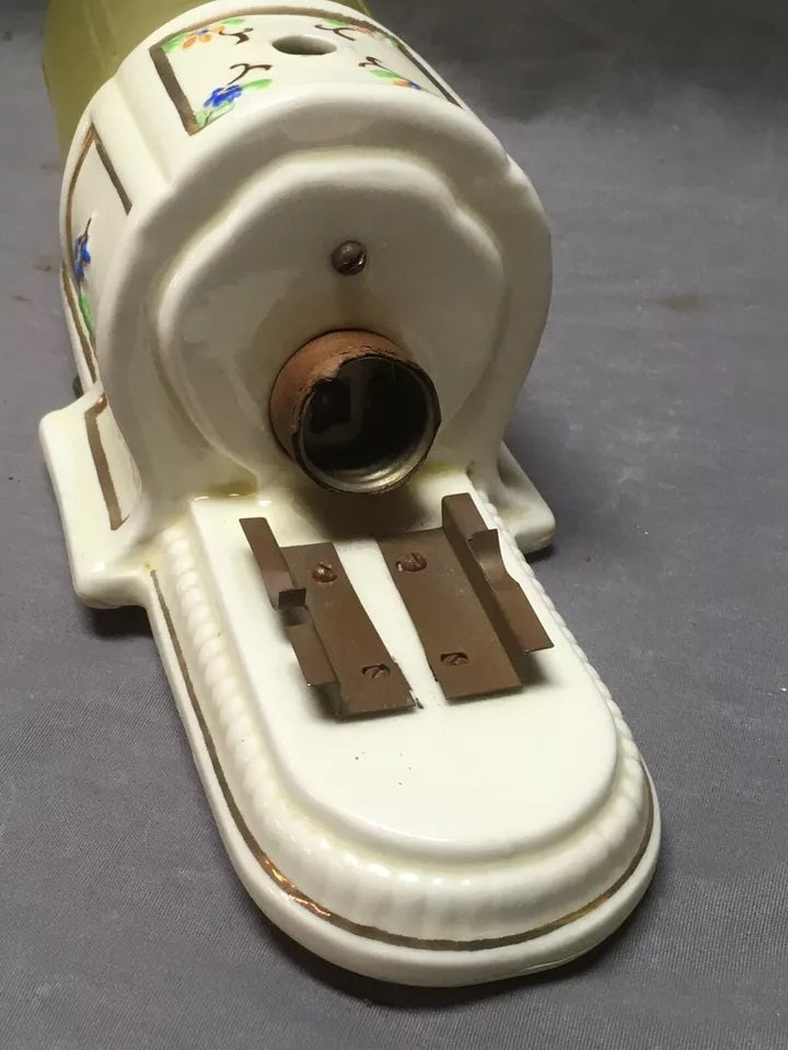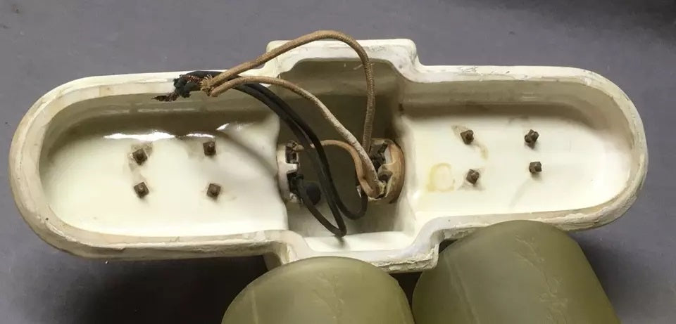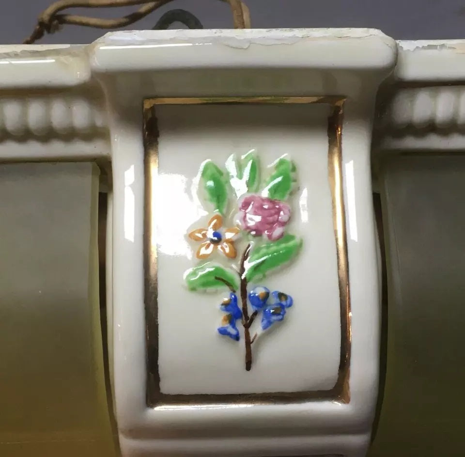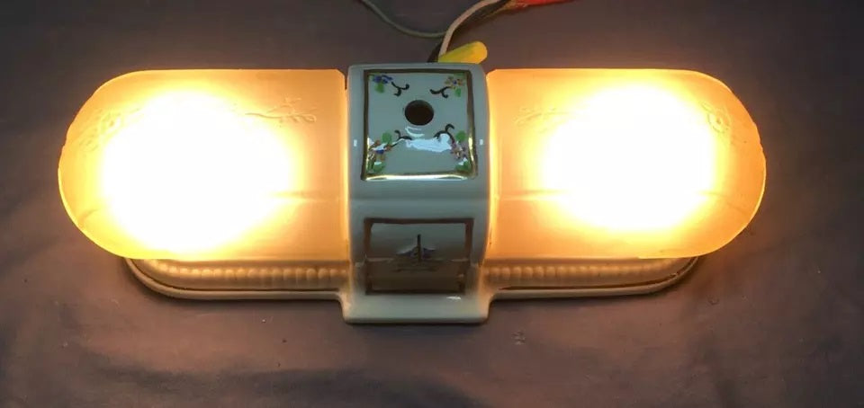 Vintage Art Deco double bulb ceiling light, wall sconce light fixture with amber stained-glass slip shades. The porcelain ceramic has a nice antique off-white color with pink, orange and blue flowers and gold trim highlights. Does have a small crack as shown. It has been repaired, but it's a quality repair that is not noticeable when installed. Both shades have the normal fleabites around the fitter edges, but one does have a tiny hairline on one side of the open end. The sockets and wires look original and does work as tested. Overall, in salvaged condition. Please look over the pictures and ask questions when needed. Thanks for looking.