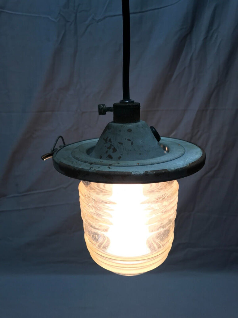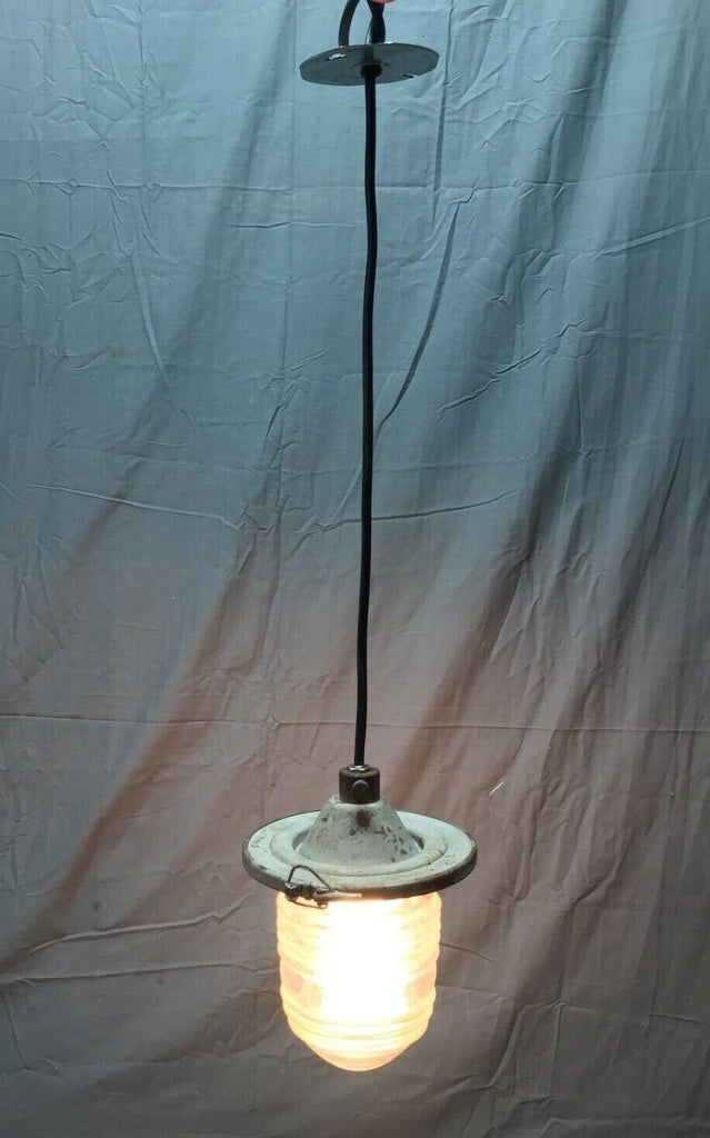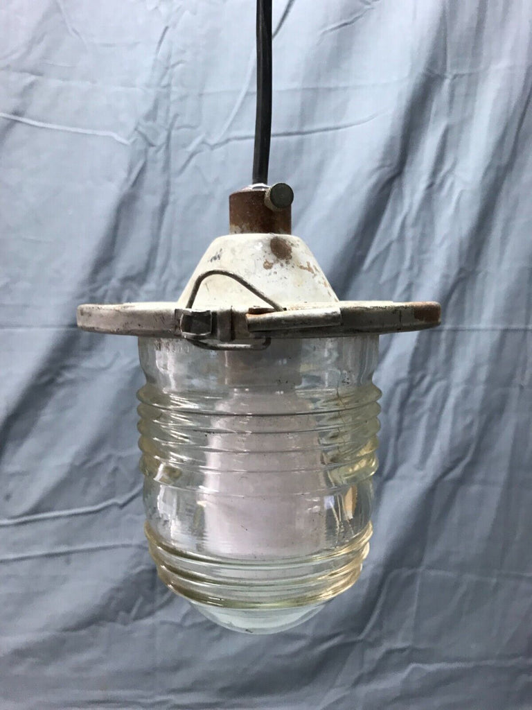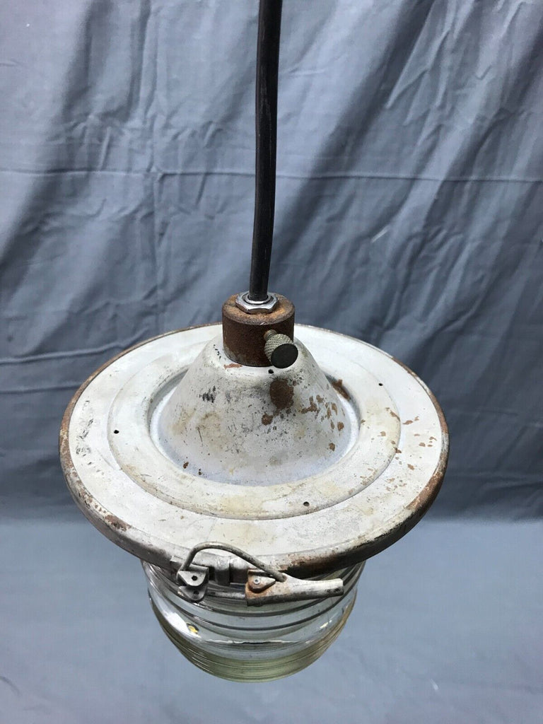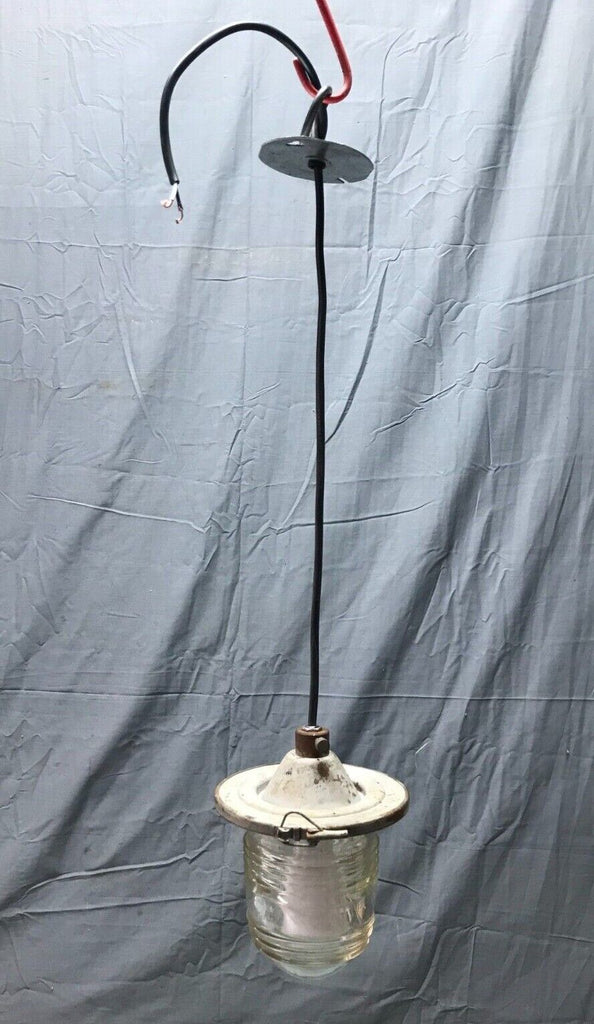 Nice vintage industrial factory exterior hanging ceiling light fixture with jelly jar style glass shade. The fixture is metal. The glass shade is marked lights incorporated code 52145 made in USA. The glass shade has no cracks but has two chips on the raised rib section as shown in photo 12. The shade is held on to the fixture with a clip clamp. The wire, porcelain socket and top mounting plate are new, and the light does work as tested. Overall good, salvaged condition. Please look over the pictures carefully and ask any questions if needed. Thanks for looking.