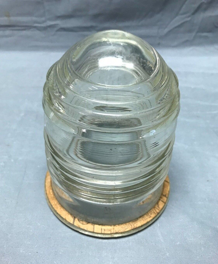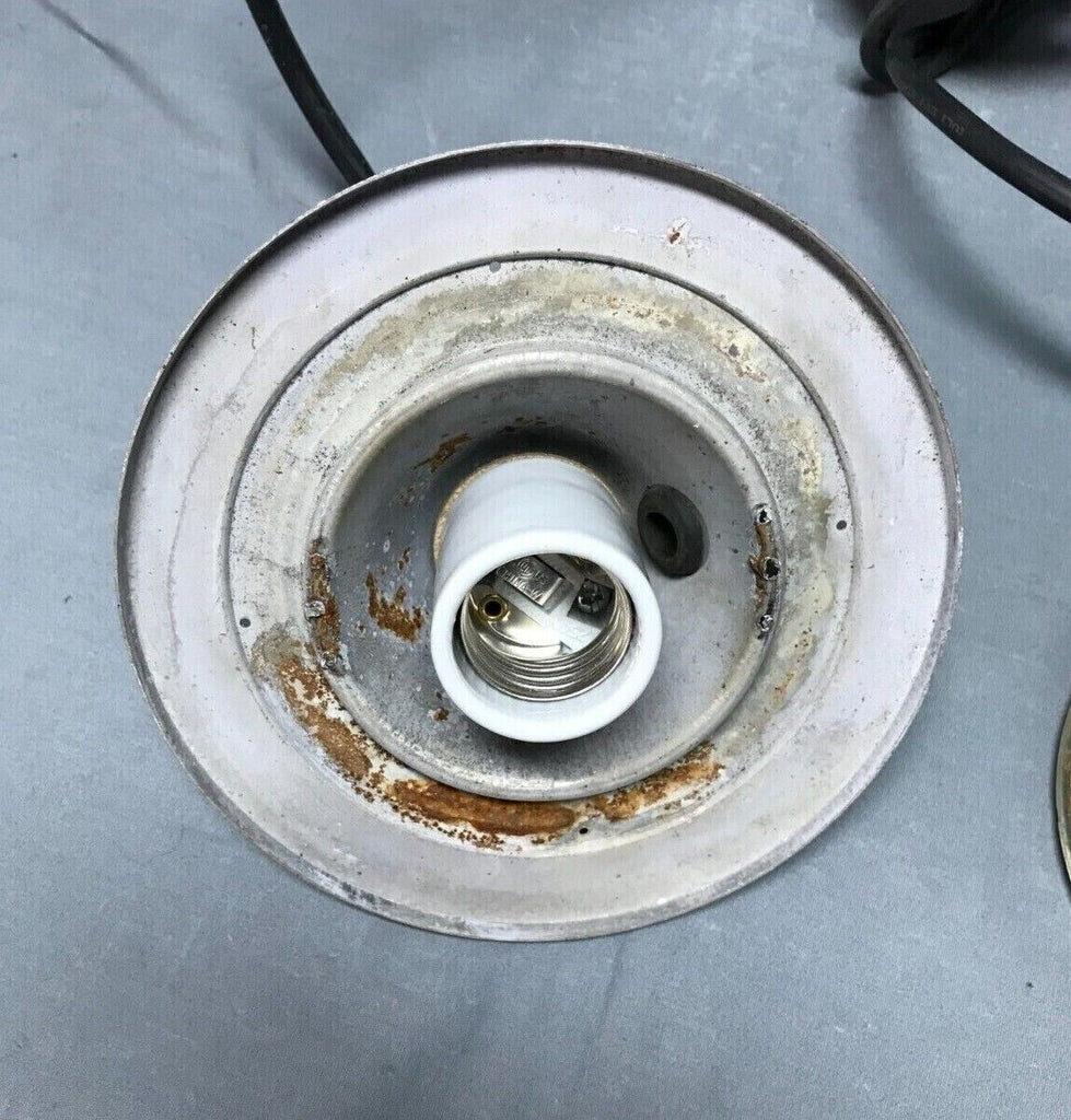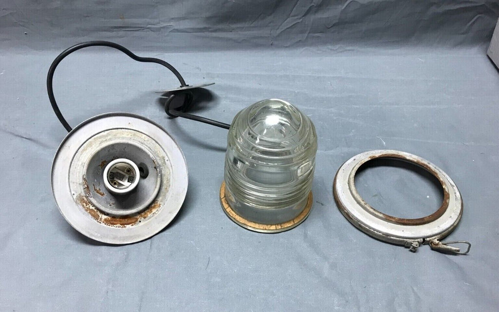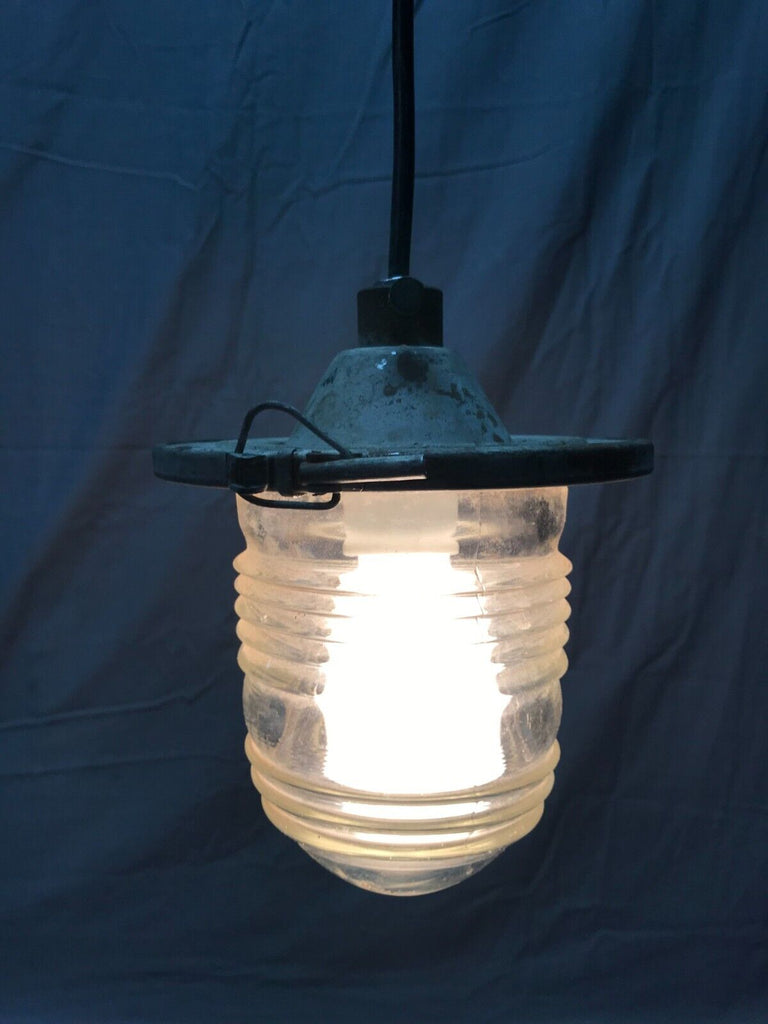 Nice vintage industrial factory exterior hanging ceiling light fixture with jelly jar style glass shade. The fixture is metal. The glass shade is marked lights incorporated code 52145 made in USA. The glass shade has no cracks but has two chips on the raised rib section as shown in photo 12. The shade is held on to the fixture with a clip clamp. The wire, porcelain socket and top mounting plate are new, and the light does work as tested. Overall good, salvaged condition. Please look over the pictures carefully and ask any questions if needed. Thanks for looking.