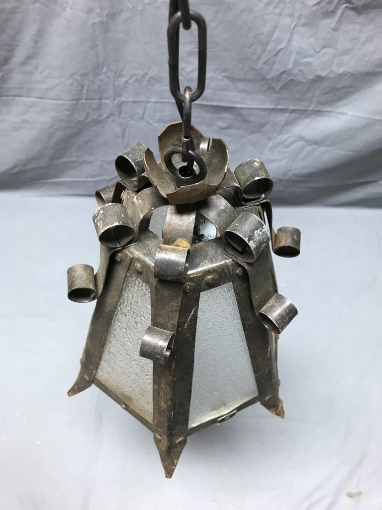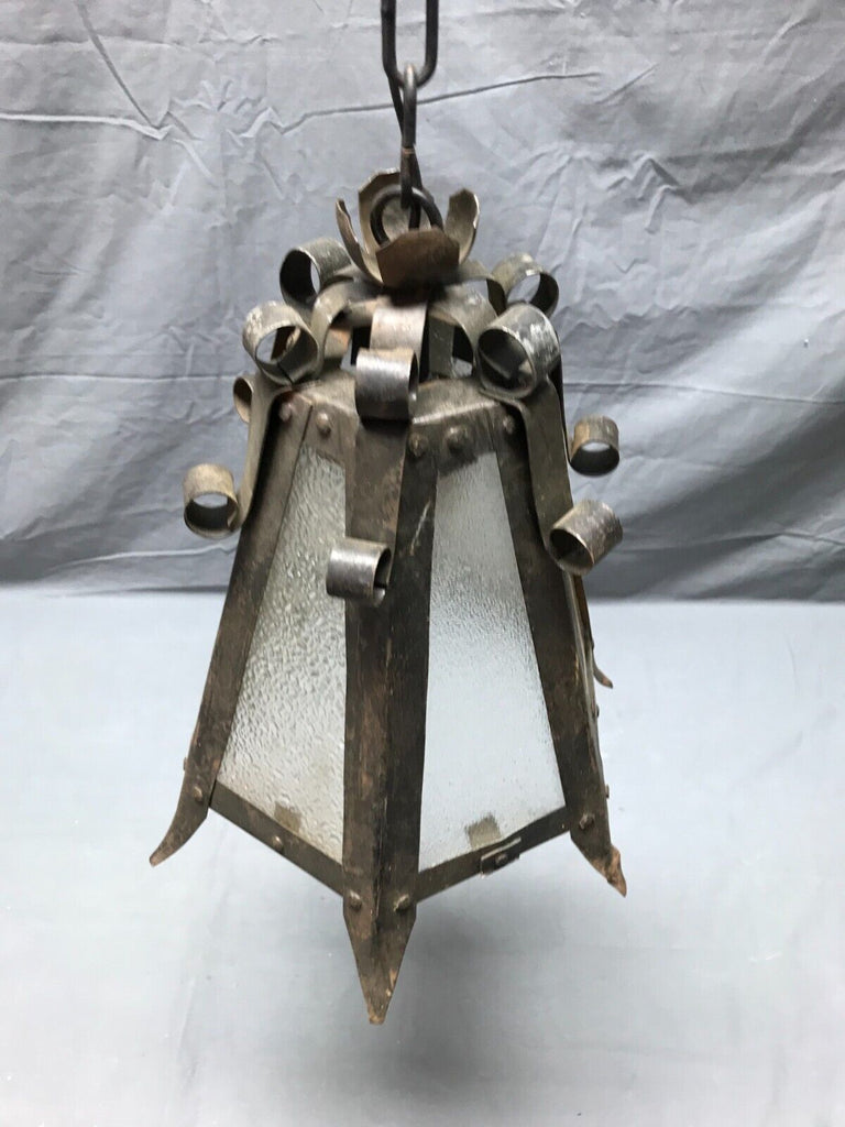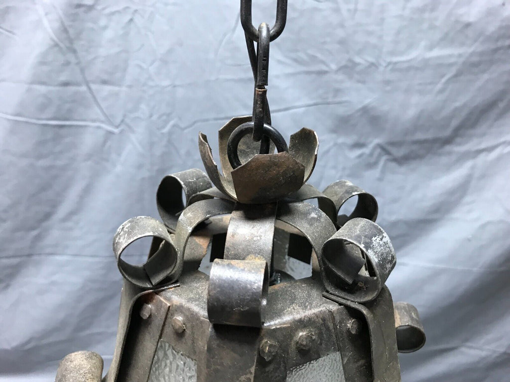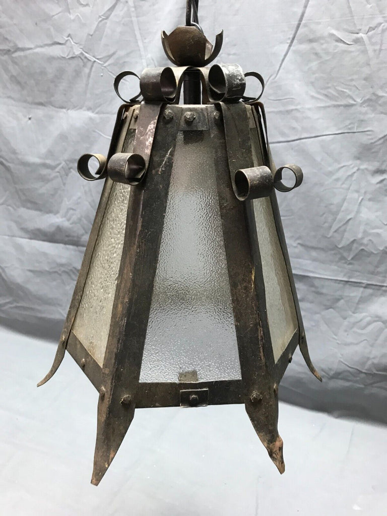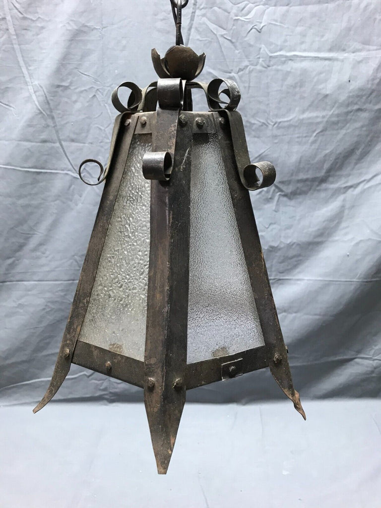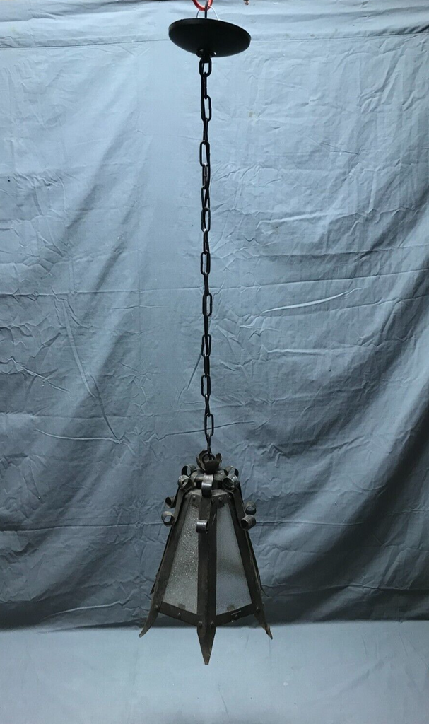 Nice vintage black porch hanging light fixture. The light fixture is in a worn black finish. The light has 6 individual panes of textured privacy glass. The glass is complete and in good condition. The light fixture and canopy are metal. The chain is steel. The canopy, wire and porcelain socket are new and works as tested. The ceiling mounting hardware is included. Please look over the pictures below and ask questions when needed. Thanks for your interest.