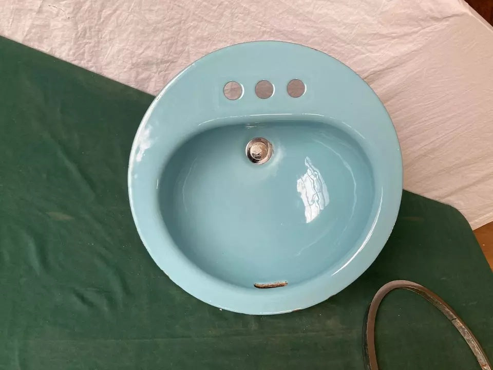 Vtg Mid Century 18" Cast Iron Regency Blue Round Drop in Bath Sink 35-25E