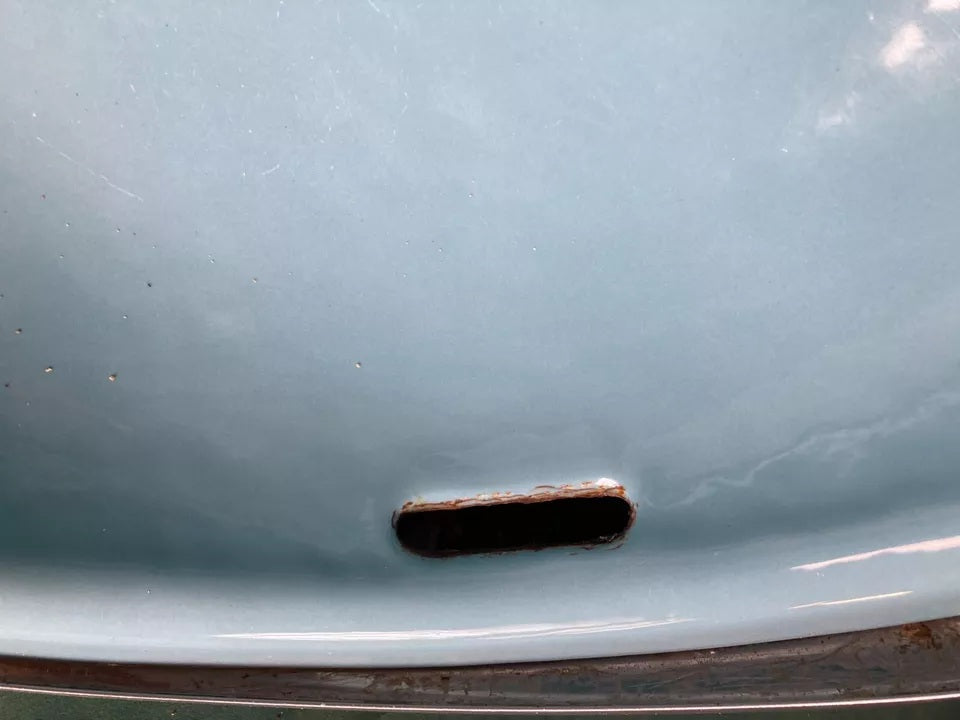Vintage mid-century round cast iron regency blue porcelain drop-in bathroom sink. It is marked American Radiator & Standard Sanitary c.1960s. The porcelain shows normal wear, light scratches & scuffs, a few pockmarks, a light outline from an old faucet (would be covered with installation of new faucet), and a little distressed porcelain around the drain and the overflow. The original stainless steel mounting ring is included as shown, it will need the under-mount clips for installation. Overall good, salvaged condition. Please be sure to look over all of the pictures as they are the best description. Feel free to ask questions when needed. Thanks for looking!