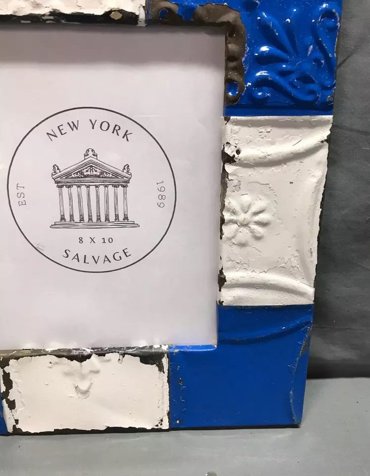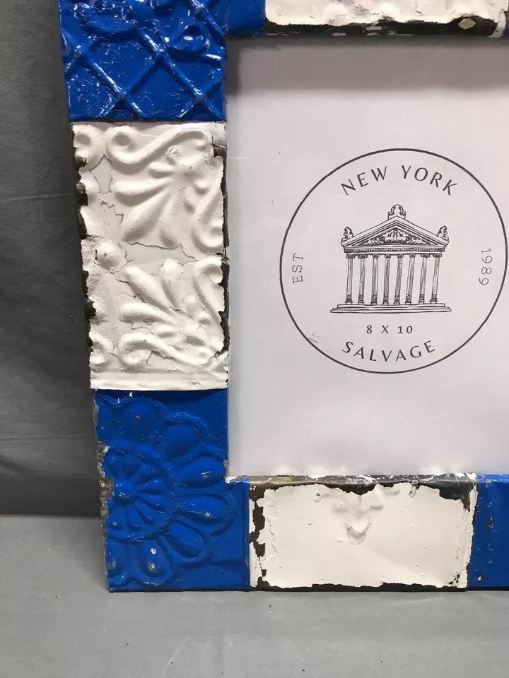 This tin picture frame 8" x 10" was made from wood and wrapped in authentic antique salvaged tin ceiling pieces. The tin is repainted in a lightly distressed blue & white. Tin has nice decorative scrap tin pieces. A new glass, backing and wall hanger is installed. Nice, repurposed home decoration would like nice in a bathroom or guest bedroom. The tin is old and will have nail holes, dings and dents. Overall, in a good condition. Please look over the pictures and ask questions when needed. Thanks for looking.