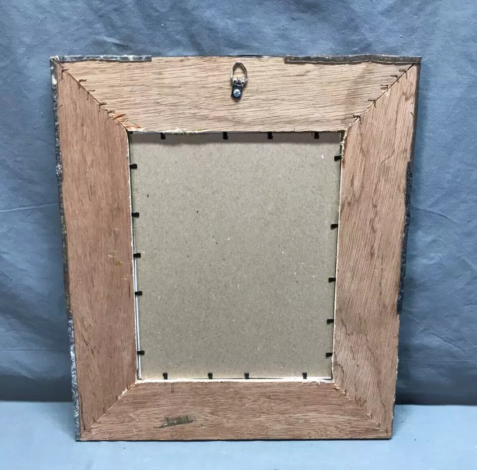 This tin picture frame 8" x 10" was made from wood and wrapped in authentic antique salvaged tin ceiling pieces. The tin is in as found original colors. Bare metal, tan, off-white, green and lite surface rust. Tin has nice decorative scrap tin pieces. A new glass, backing and wall hanger is installed. Nice, repurposed home decoration would like nice in a bathroom or guest bedroom. The tin is old and will have nail holes, dings and dents. Overall, in a good condition. Please look over the pictures and ask questions when needed. Thanks for looking.