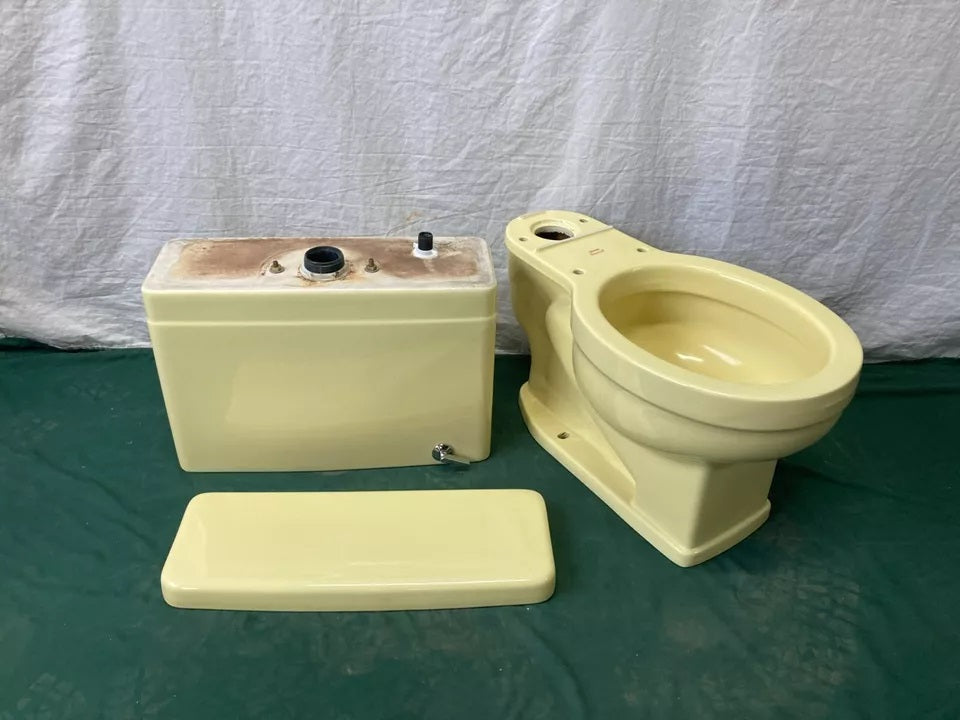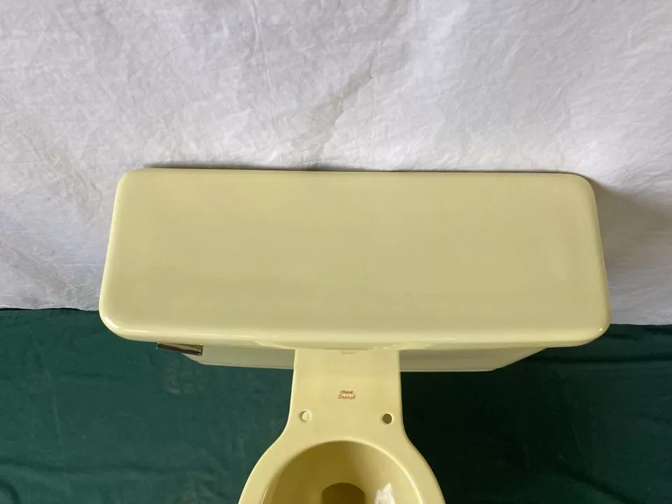 Nice antique ceramic Citrus Yellow porcelain toilet with a round bowl. It is marked Crane Drexel c.1950s. The porcelain shows normal wear, minor scratches & scuffs, the chrome flush lever looks good. the tank parts look complete but are untested, they may need repair or replacement. The original color matching porcelain bolt cap covers included as shown. Overall good, salvaged condition. Please look over the all the pictures as they are the best description, feel free to ask questions when needed. Thanks for looking!