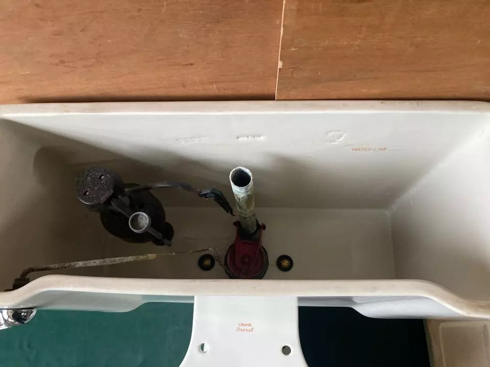 Vintage mid-century White ceramic toilet with a round bowl. It is marked Crane Drexel c.1950s. It shows mostly normal wear, minor scratches & scuffs. There are long hairlines in the bottom of the tank, it was in use up until we acquired it and was not leaking. We have coated the bottom of the tank with epoxy and then sealed the openings and let it sit for 24 hours with water in it, the cracks do not leak. The chrome flush lever has scratches and some pitting. The tank parts look complete and were working when removed, but we cannot guarantee them, they may need repair or replacement. Overall salvaged condition. Please look over the all the pictures as they are the best description, feel free to ask questions when needed. Thanks for looking!