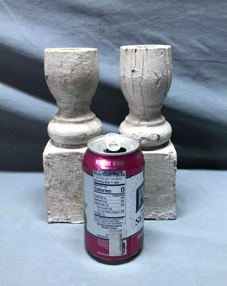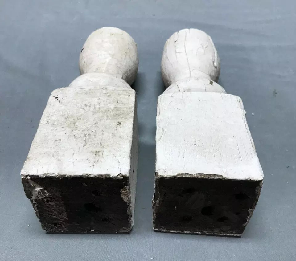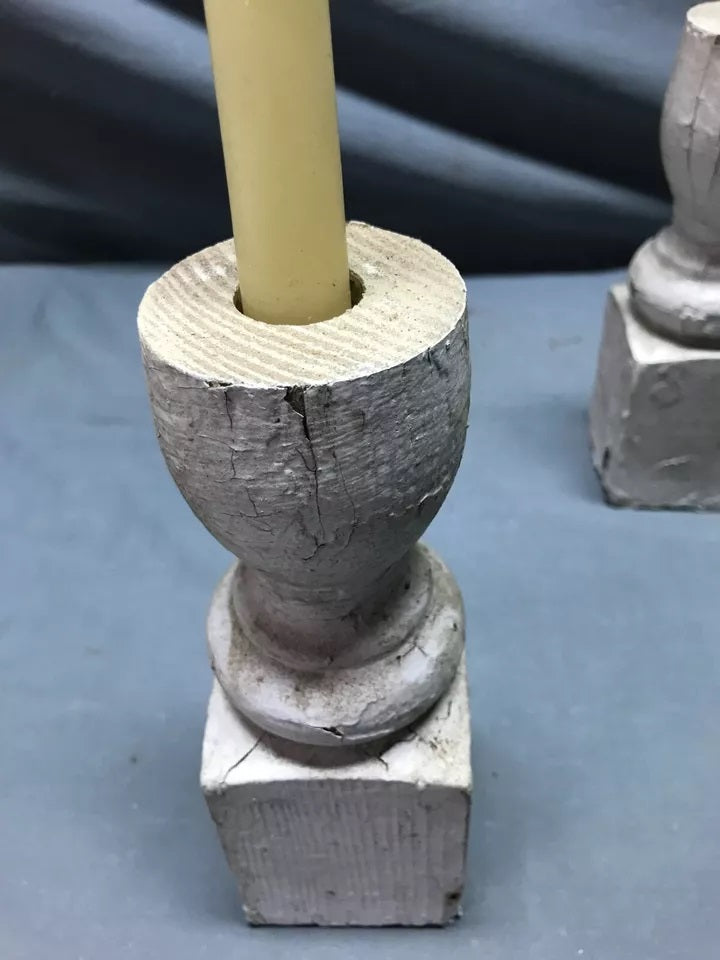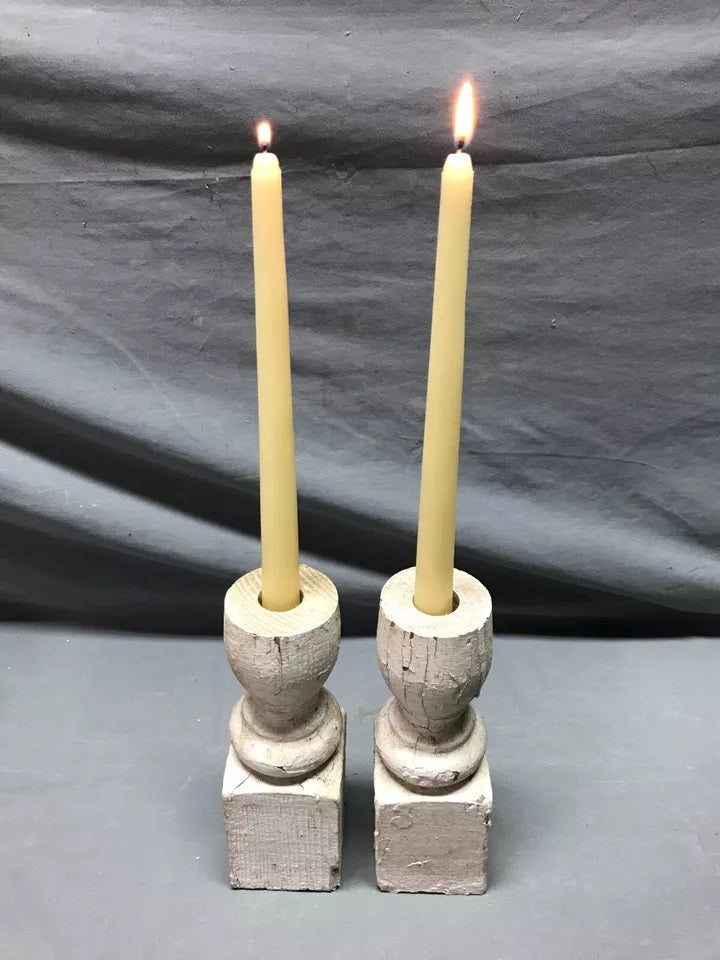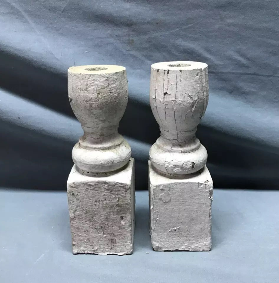 Nice pair of antique turned wood chunky spindle candle stick holders. The tops are flat with a center hole. We did make the set from a larger spindle. They have decorative Victorian turnings and are painted in a destressed dirty crackled shabby white finish. Expect some loose paint chips during shipping. Could use a cleaning. They do have some nail holes and small splits. They make great candle stick holders. The candle holes are 7/8" on tops. The candles are for photo purposes only and are not included. The pair is in good solid condition. Please look over the pictures and ask questions when needed. Thanks again for looking!