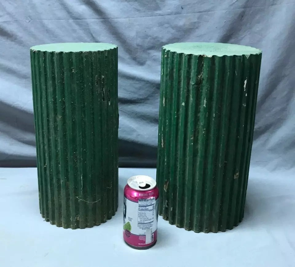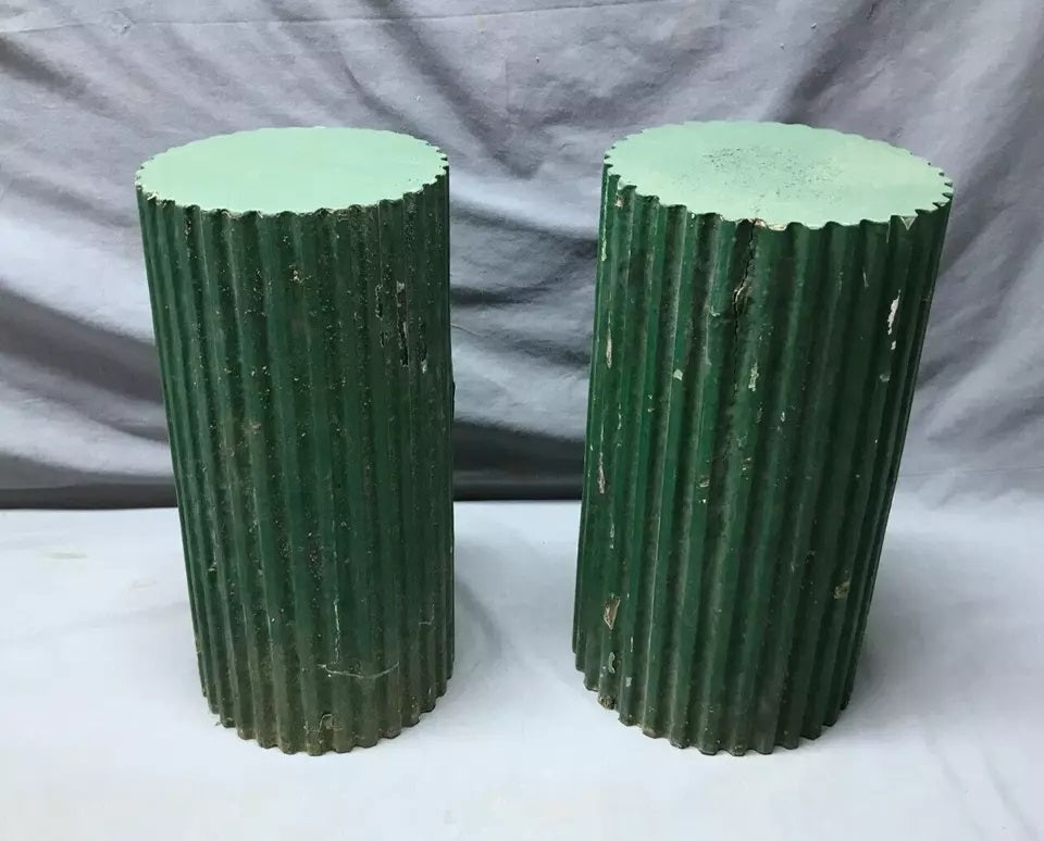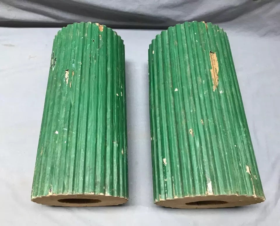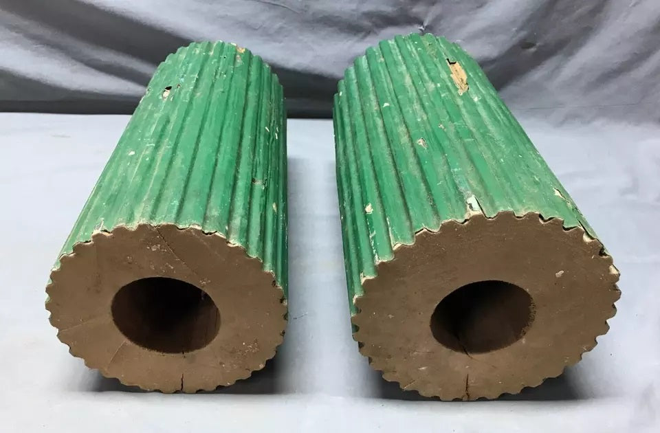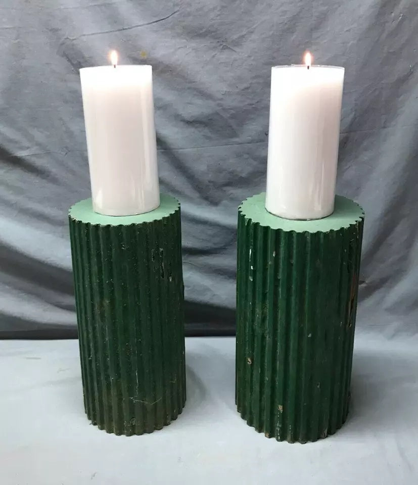 This is for a set of 2 thick antique turned wood chunky candle holders. There might be a slight difference between both holders. The tops are flat. We did make the set from a 1890's fluted column. They are hollow centers, and the tops were plugged and painted. They have nice vertical fluting and are painted in a shabby chipped green. Expect some loose paint chips during shipping. Could use a cleaning. They do have some nail holes and small chips. The wood is unknown. Would be great chunky pillar candle holders, or plant stands. The 4" candles are for photo purposes only and are not included. Please look over the pictures and ask questions when needed. Thanks again for looking!