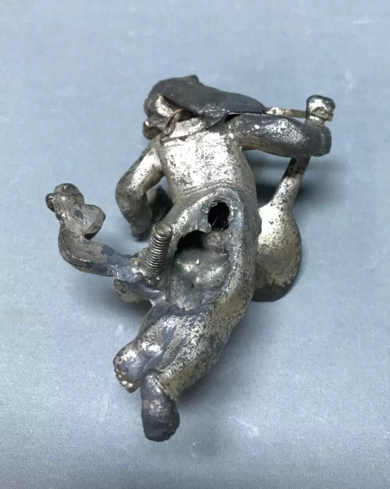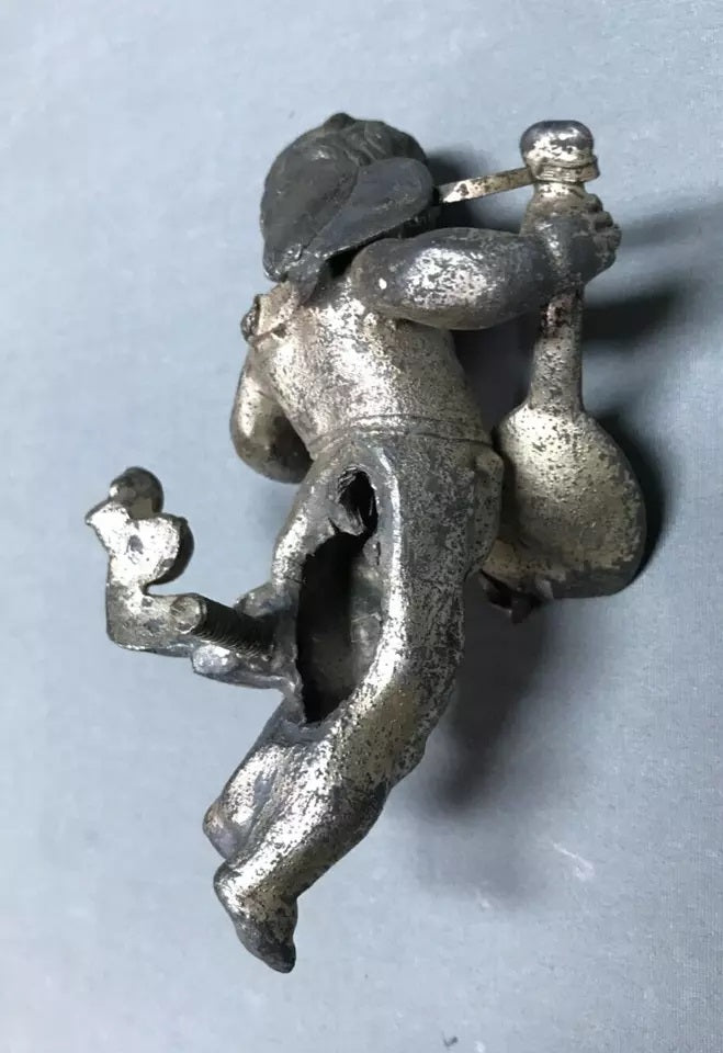 Nice vintage classical Cupid. The figure originally looks like it was mounted on a lamp fixture or chandelier. Does look to be made of a pot metal with a worn nickel finish. Does look complete but the lower strap for his harp is loose. He is holding a bird in his other hand. The nickel finish shows wear and has, scratches, scuffs and worn spots. The backside has a 1/4" treaded stud for mounting. The mounting nut is missing. The classical cupid is unmarked, the manufacturer is unknown. Great decor for a shelf or custom light fixture. Overall, in salvaged condition. Please look over the pictures and ask questions when needed. Thanks for looking.