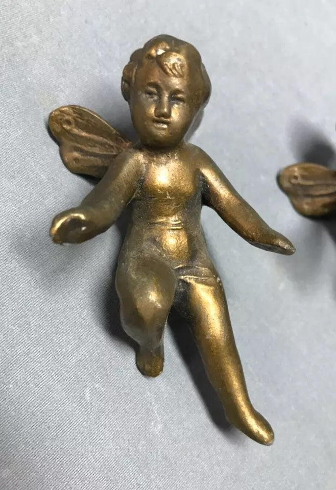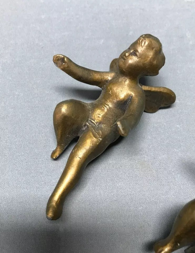 Nice vintage pair classical Cupids. They are identical. The figures originally look like there from a lamp fixture or chandelier. Does look to be made of white metal (nonmagnetic). with a worn nickel finish. Both look complete with wings, feet and hands. The brass-colored finish shows wear and has, scratches, scuffs and worn spots. The classical cupids are unmarked, the manufacturer is unknown. Great decor for a shelf or custom light fixture. Overall, in salvaged condition. Please look over the pictures and ask questions when needed. Thanks for looking.